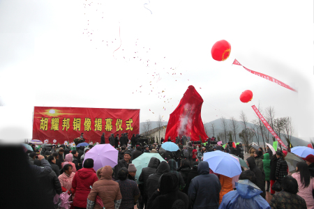 來自全國墾荒隊員、普通群眾及美術界人士自發冒雨參加胡耀邦巨像揭幕式